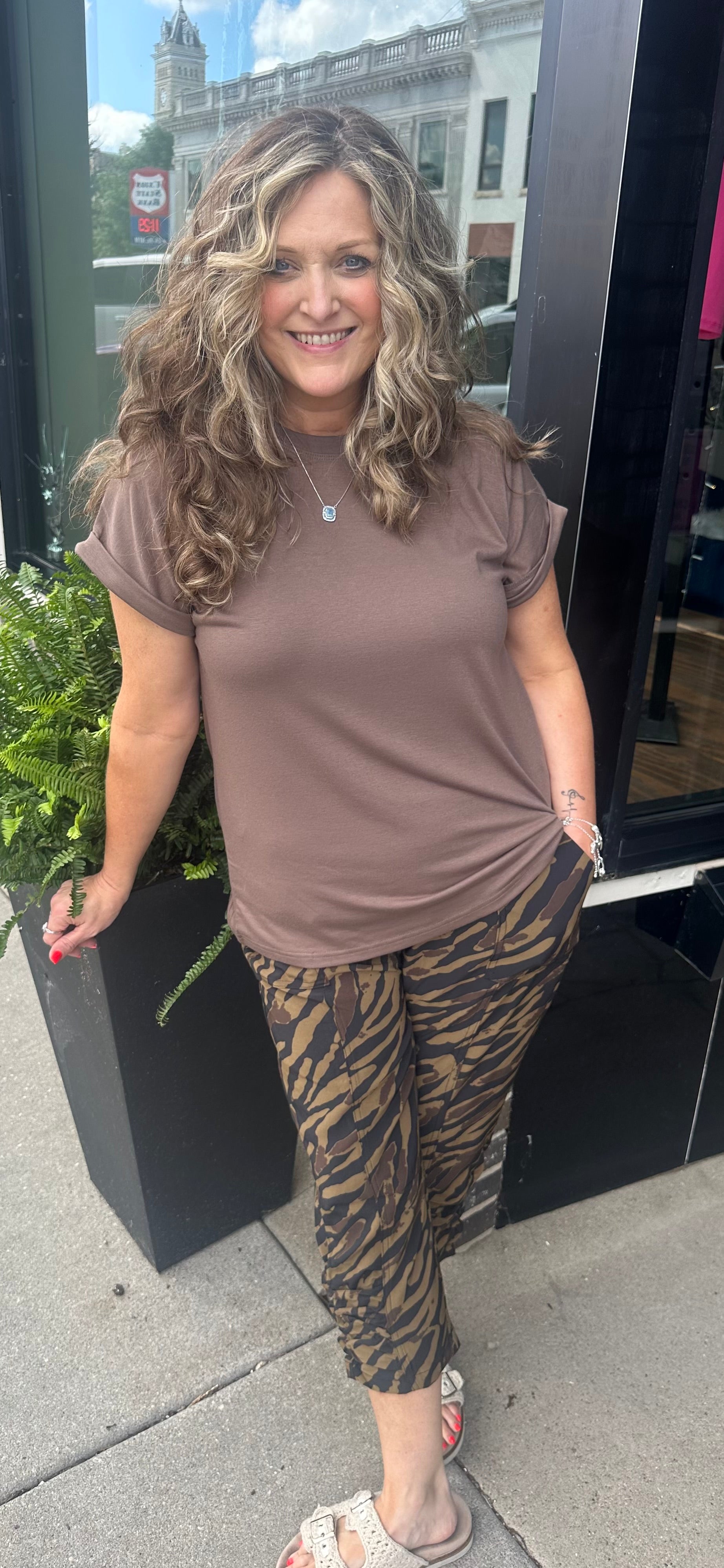 Say hello to your new favorite: the Coffee Round Neck T-Shirt. With a cozy round neck, cute cuff sleeves, and a relaxed loose fit, it’s perfect for lounging solo or layering up for an adventure. Comfy enough to wear all day, it’s a playful wardrobe staple that keeps you feeling great while looking effortlessly cool.