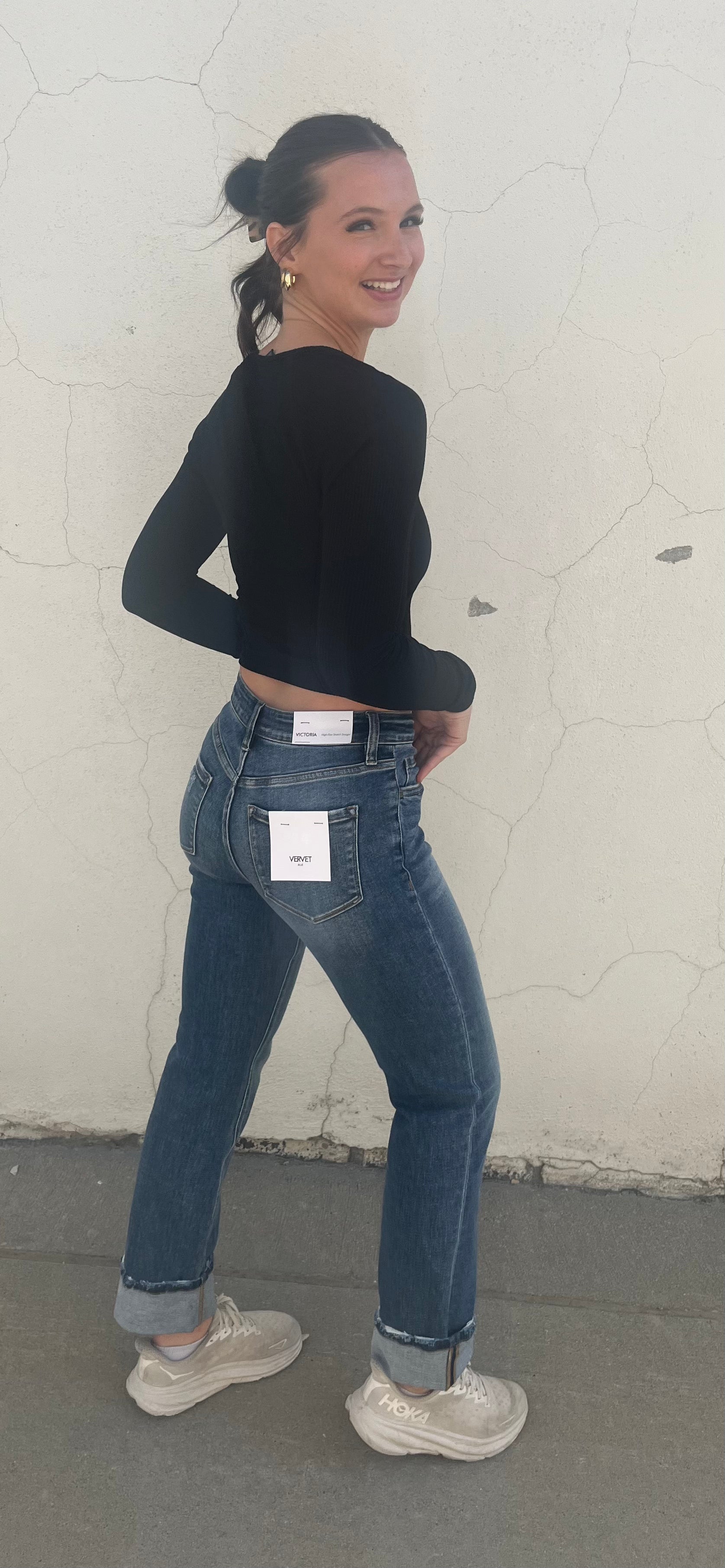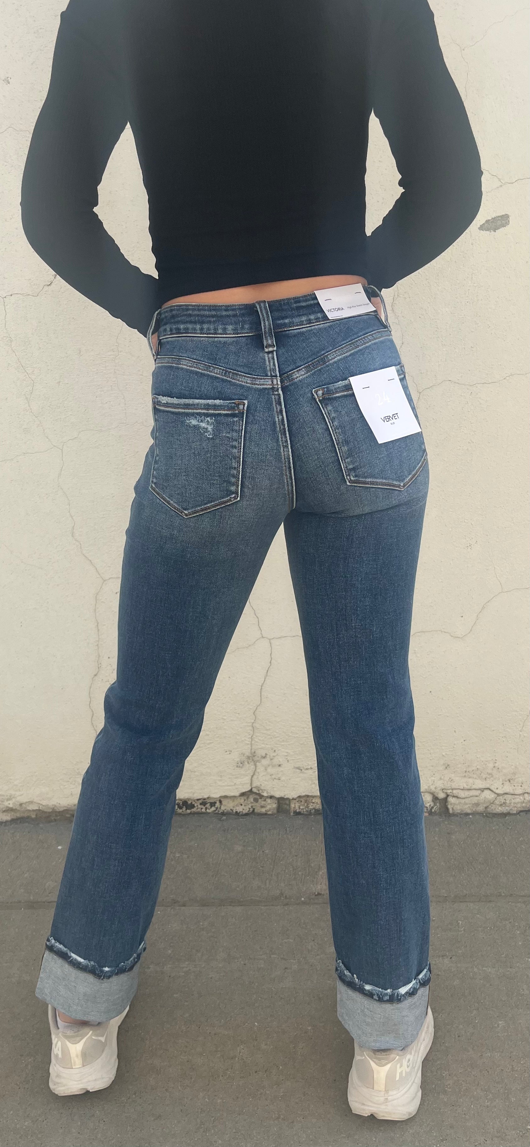 Meet your new denim obsession! These high-rise straight jeans feature a comfy stretch fabric that moves with you, paired with an edgy slightly distressed vibe. The unstitched cuff hem adds that effortless, just-rolled-out-of-the-closet cool factor. With a 10½" rise and 28" inseam, they hit right at the ankle for the perfect cropped silhouette. That 3" x 1" cuff? Chef's kiss. It's no wonder these are flying off the shelves—comfort meets style in the most craveable way.