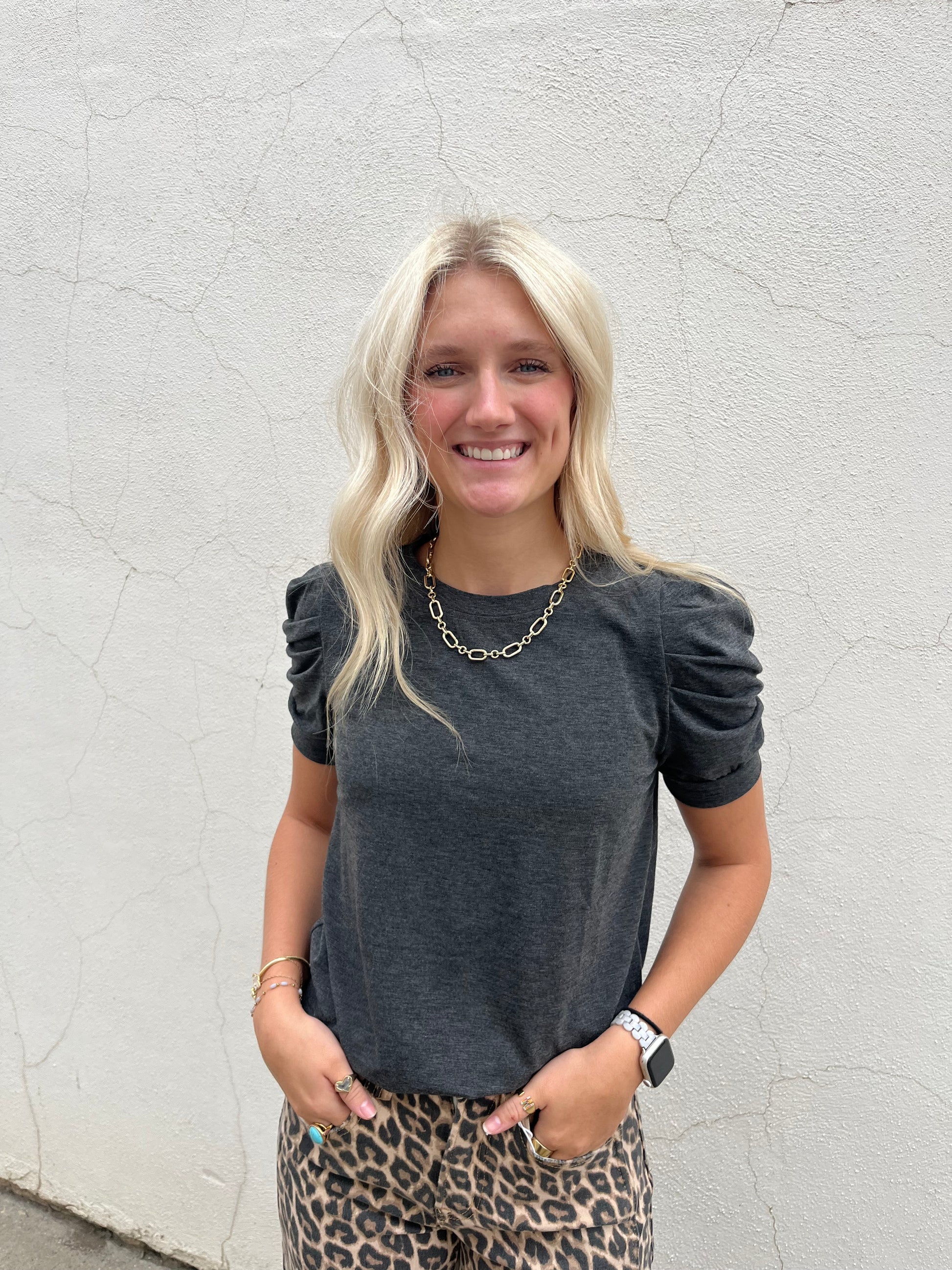 The Puff Sleeve Solid T-Shirt in dark grey is your playful, comfy staple. Its great neutral color matches everything, making it perfect for casual days when you want to feel cozy without losing style. The puff sleeves add a fun, flirty touch to a simple favorite you’ll reach for again and again.