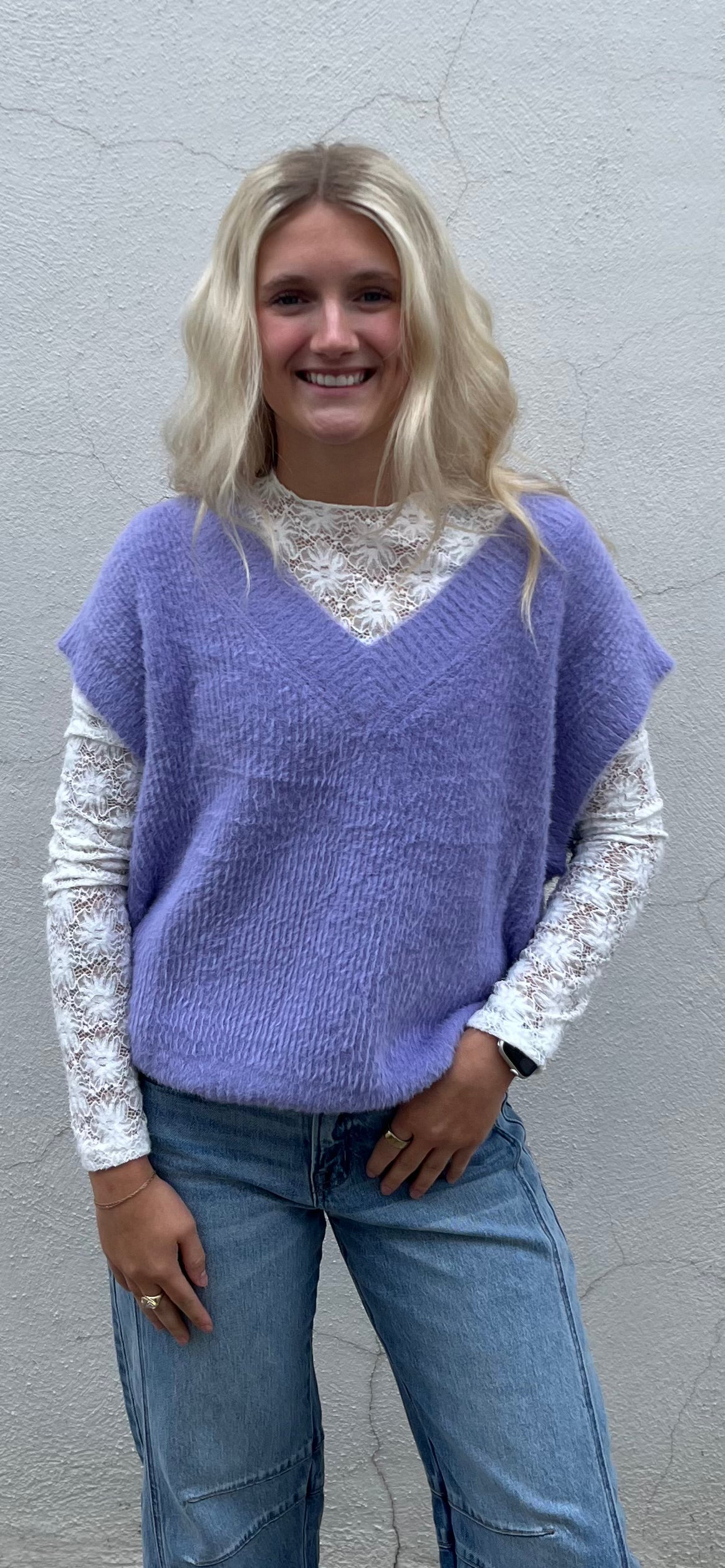 Cozy up in this super soft fuzzy sweater vest that's perfect for layering over a fitted mesh top. Whether you're headed to work or out for play, this trendy piece adds warmth and style with a playful nod to the Go Cats spirit. Stay comfy, chic, and ready to cheer!
