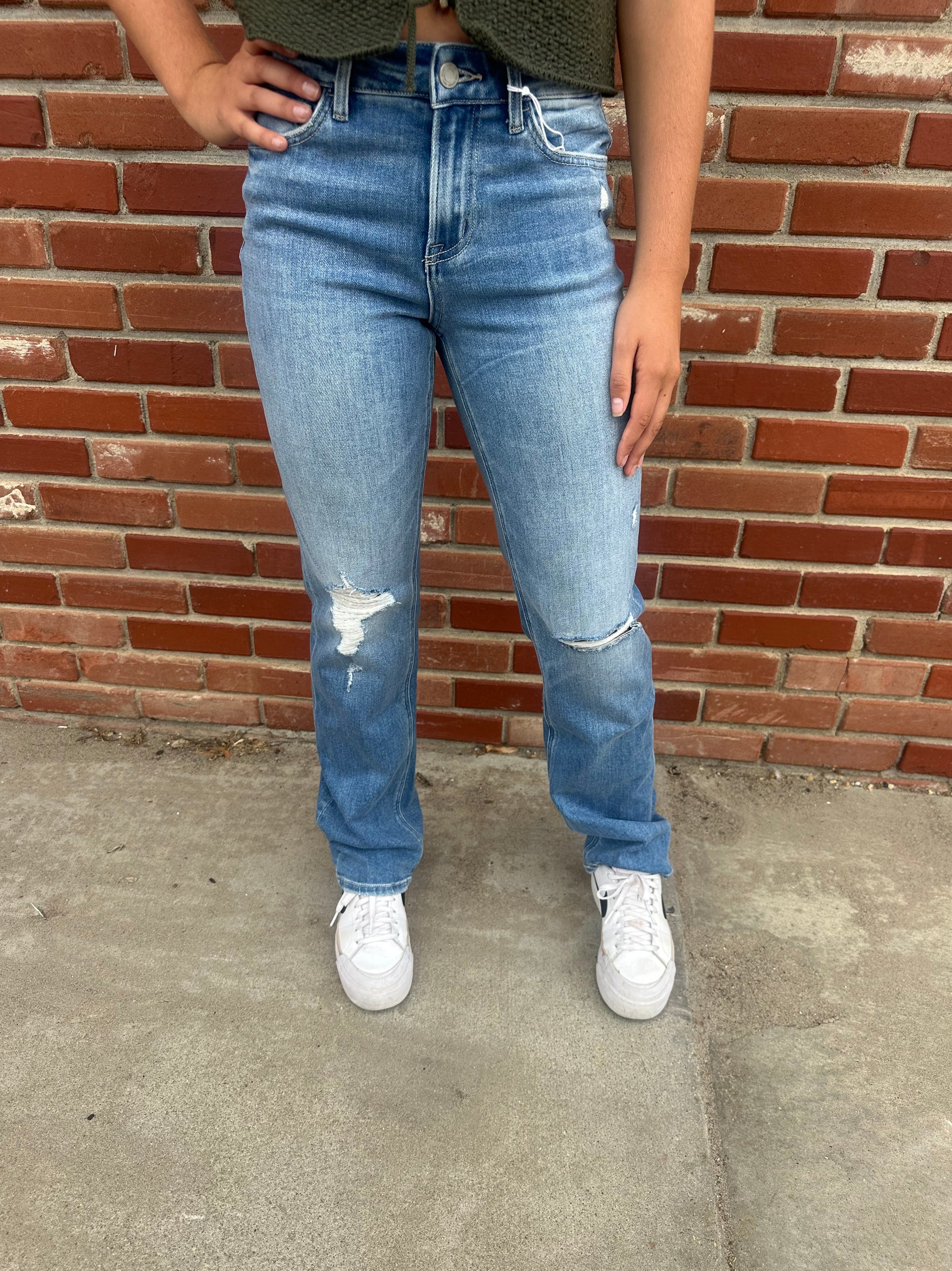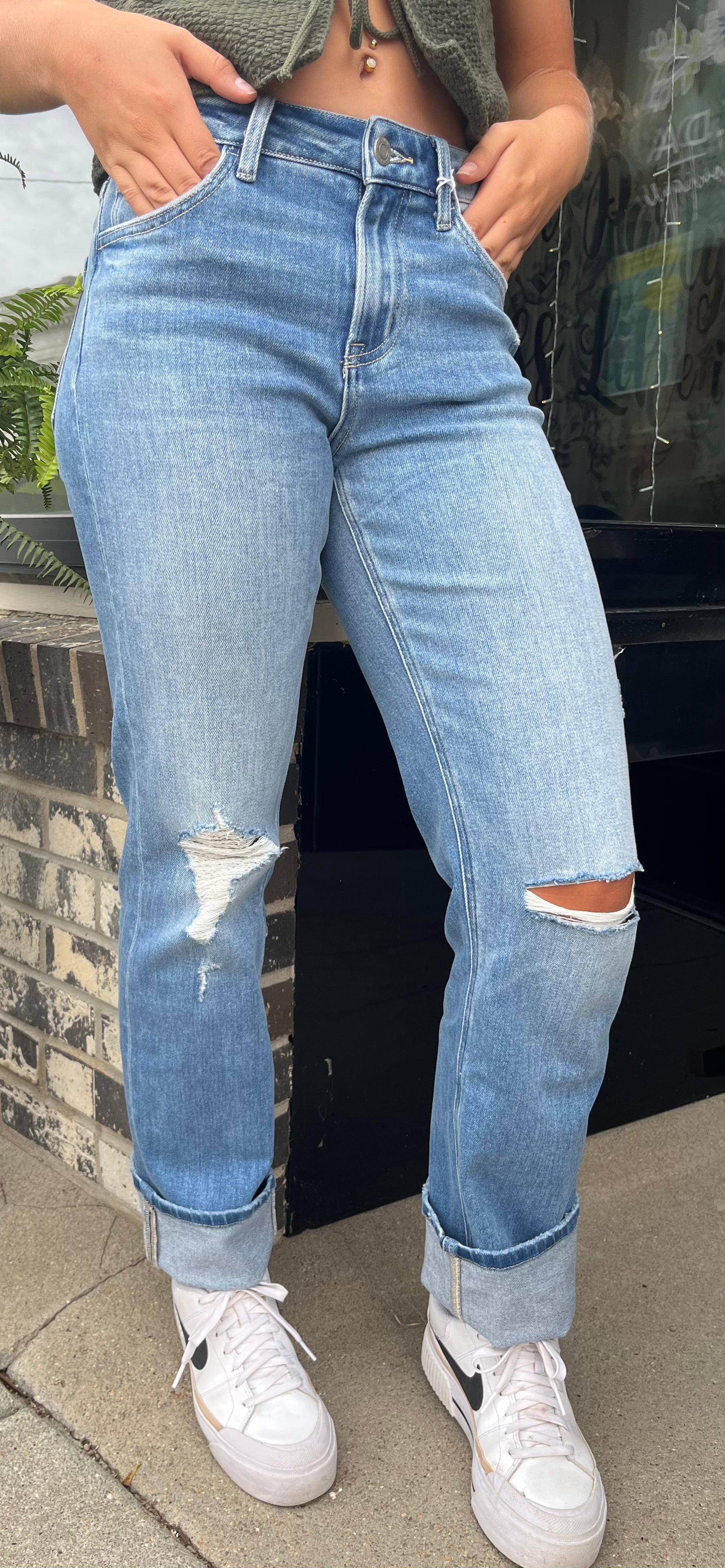 Get ready to rock the latest trend with the Well-Bred Distressed Straight Jean! These high-waisted jeans boast a 10-inch rise and playful distressed details that add just the right amount of edge. The comfort stretch fabric moves with you, while the 32-inch inseam and 16-inch leg opening create a relaxed yet flattering fit. Perfect for mixing and matching your favorite looks with a fun, confident vibe. Wear this jean with or without a cuff!